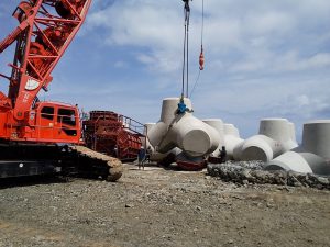 本工事は島牧村の厚瀬漁港の整備を目的とした工事であり、消波ブロックの製作と古くなった消波ブロック・灯台の入れ替え、港内の浚渫(海底の土砂や泥を掬い取る作業)を主として施工を管理しました。